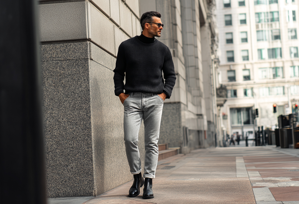 - Серые джинсы, черный свитер с горлом