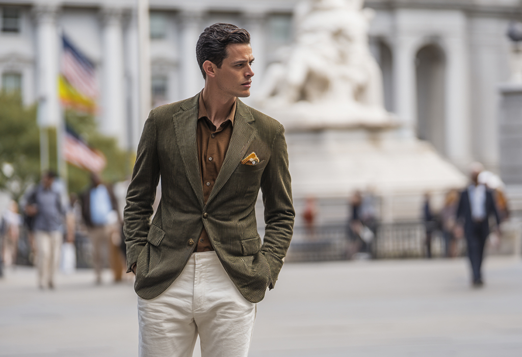 - Оливковый пиджак, коричневая рубашка, кремовые брюки